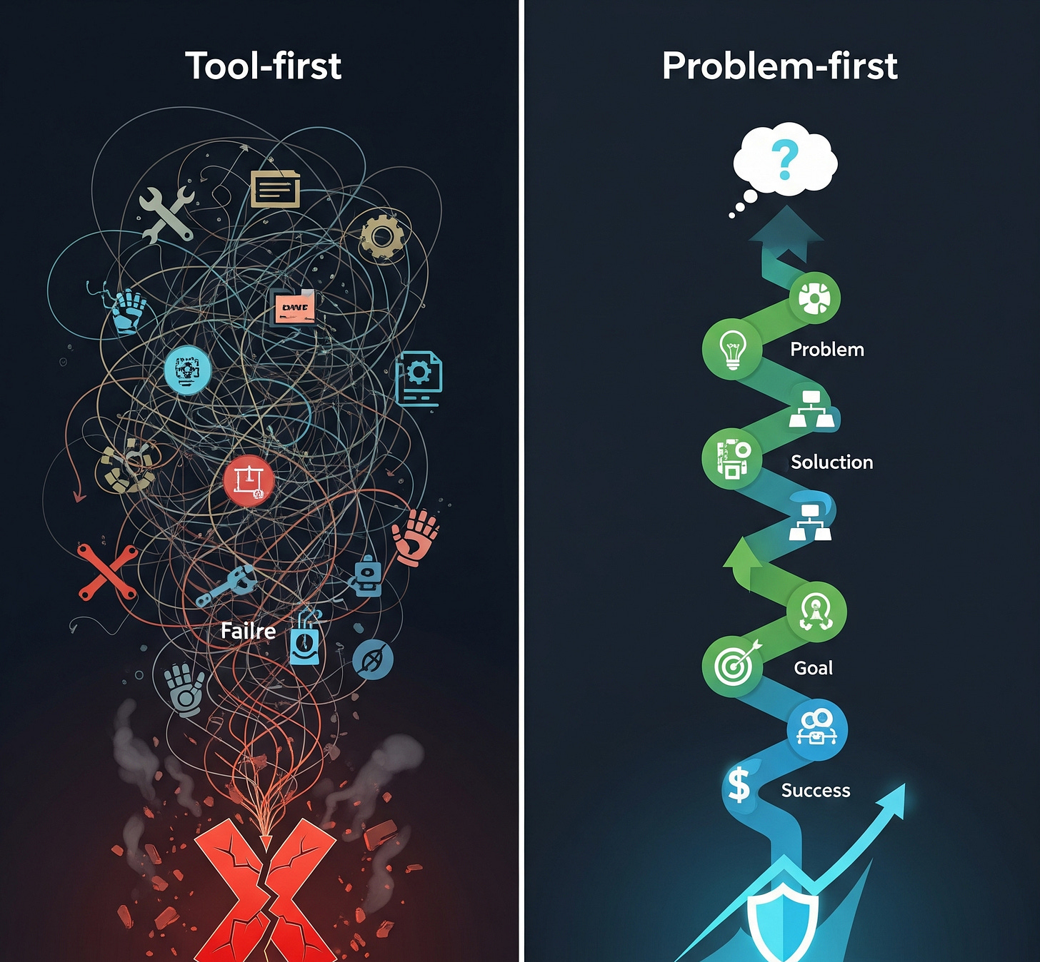 左側工具優先路徑顯示一個混亂的流程:從購買新工具開始,箭頭指向強行適應現有流程,最終導致自動化的混亂和失敗的死胡同。右側問題優先路徑則是一個清晰的結構化流程:從分析流程開始,依次指向識別痛點、排定優先級、拆解任務,最後才到選擇合適的工具,最終結果是創造實質價值。